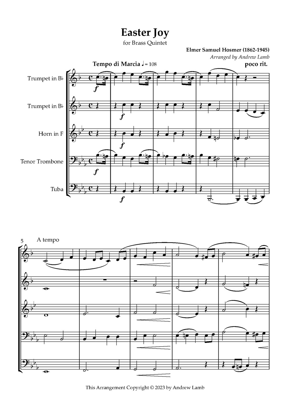 πΊ Immerse your audience in the Easter spirit with this Brass Quintet adaptation of Elmer Samuel Hosmer's 'Easter Joy'! π· Originally composed for the organ, this arrangement for 2 Trumpets, French Horn, Trombone, and Tuba delivers a fresh and uplifting rendition. π΅