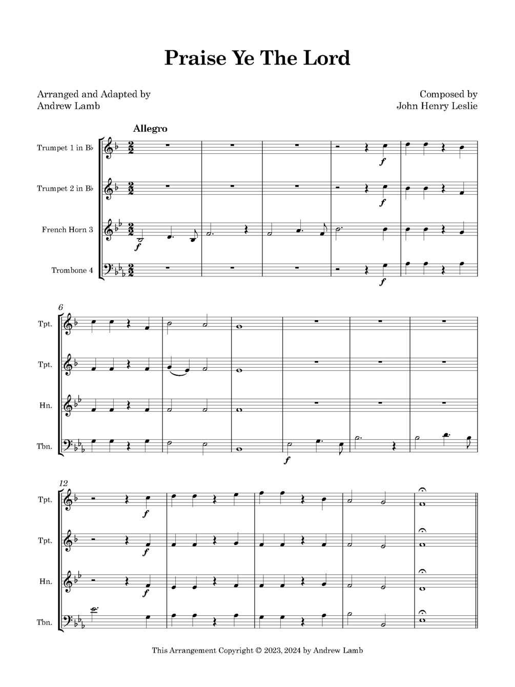 ๐บ Elevate your brass quartet performance with this stunning adaptation of "Praise Ye The Lord" by English composer John Henry Leslie, meticulously crafted by Andrew Lamb! ๐ถ
