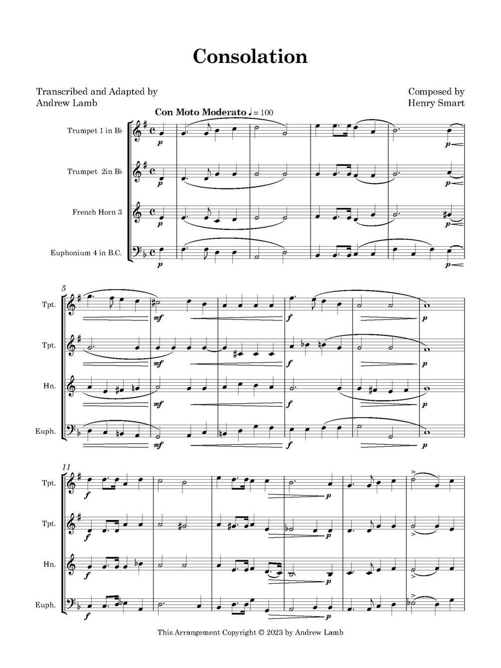 🎺 Immerse yourself in the timeless beauty of Henry Smart's 'Consolation' with this captivating Brass Quartet adaptation by Andrew Lamb! 🎶 This arrangement, thoughtfully crafted for 2 Trumpets/Cornets in Bb, French Horn, and Euphonium, introduces an enchanting musical experience.