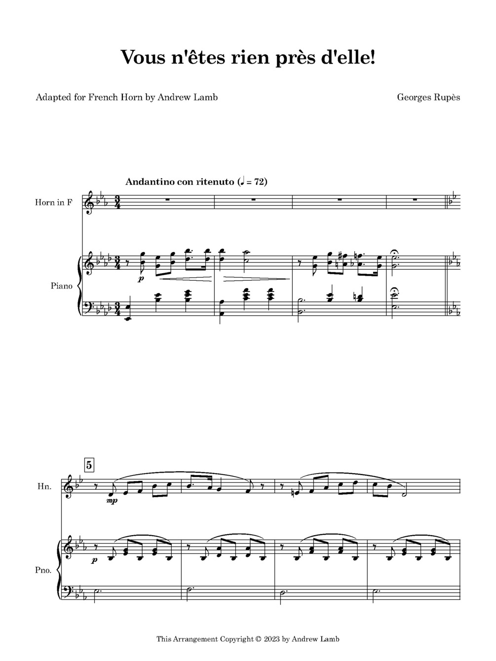 Unveil the enchanting world of 'Vous N'êtes Rien Près D'Elle' with this French Horn adaptation by Andrew Lamb! 📯 Originally composed in 1872, this arrangement for French Horn and Piano, with a Tenor Horn transposition, adds a new dimension to Georges Rupès' masterpiece. 🎼