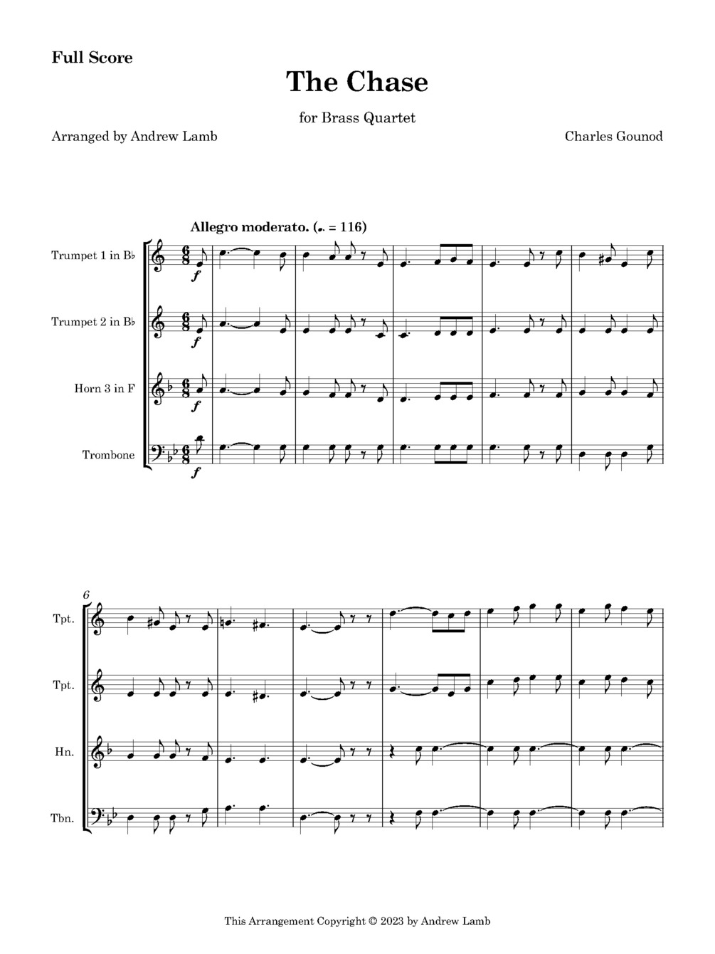 Dive into the exhilarating world of Charles Gounod with this heart-pounding Brass Quartet adaptation, skillfully arranged by the talented Andrew Lamb! Originally composed in 1872 as a song for voice and piano, 'The Chase' takes on a new, dynamic life in this arrangement scored for 2 Trumpets/Cornets in Bb, French Horn, and Trombone. 🎼